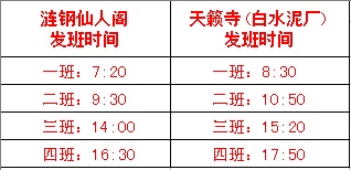 7月5日:開通漣鋼仙人閣至天籟寺、白水泥廠的專線班車,每天四班,運(yùn)行線路及發(fā)班時(shí)間如下: