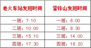 7月6日:開通老火站至古塘、雷鋒山的農(nóng)村客運(yùn)班車,每天四班,運(yùn)行線路及發(fā)班時(shí)間如下: